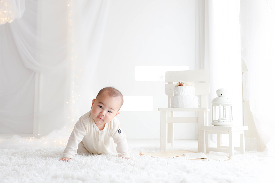 市川市にあるおしゃれな写真館「アンズガーデン市川店」でお撮りしたハーフバースデーの記念写真です。