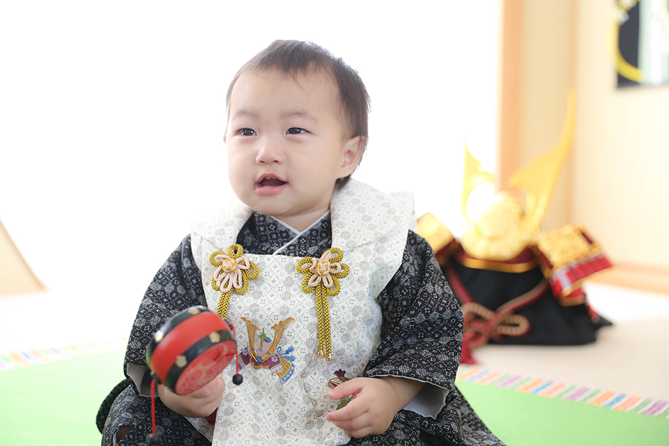 1歳バースデーと兼ねて初節句のお祝いで、兜と一緒にお撮りしました。