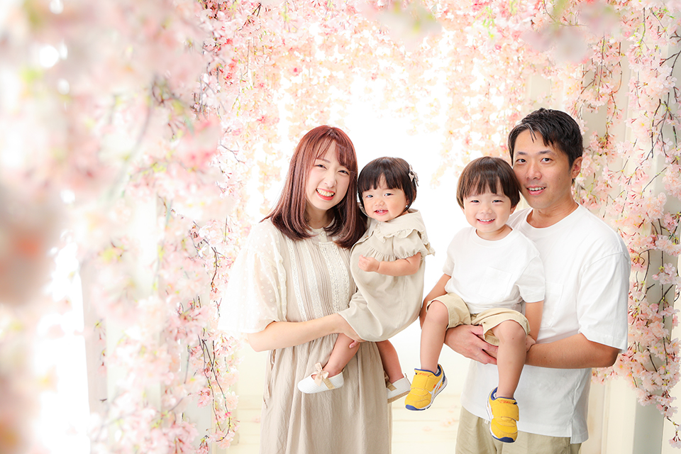 満開の桜の中、統一感のある私服姿のご家族様をお撮りした素敵な一枚です。
