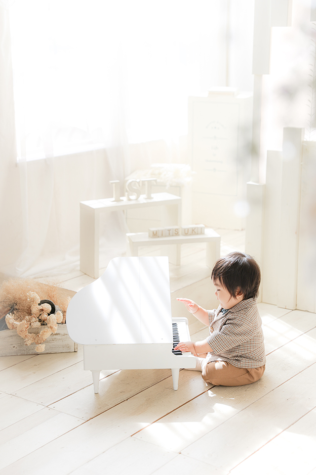 男の子様は真っ白なピアノを気に入ったご様子で、小さな指で楽しそうに鍵盤を押す姿を撮影させて下さいました。