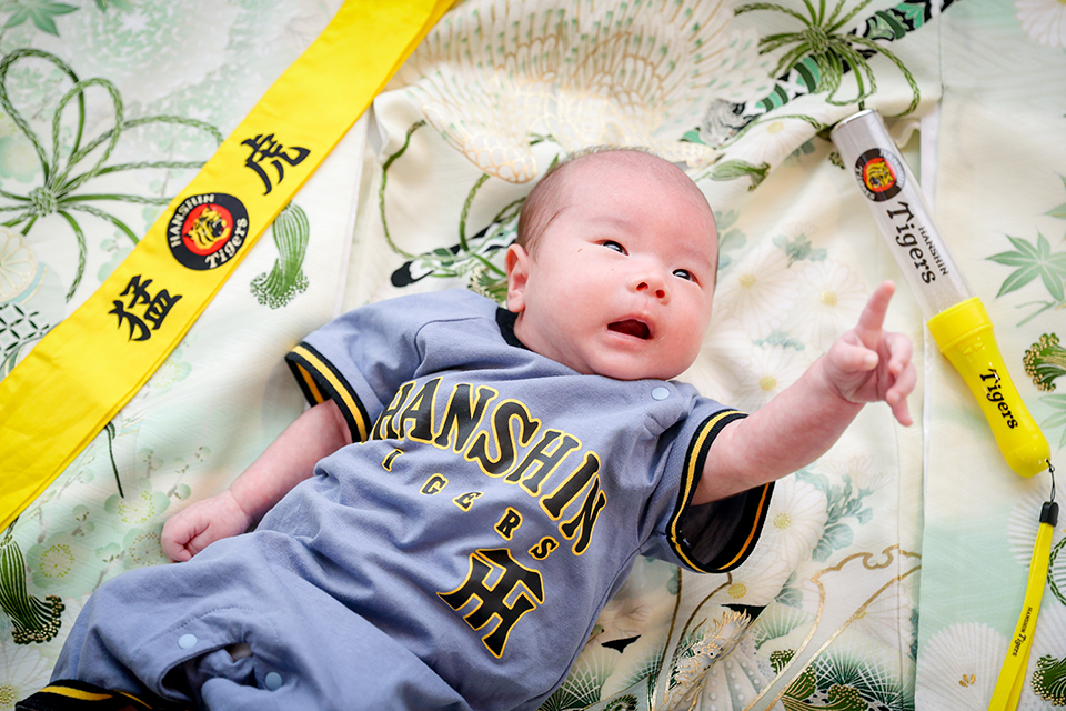 祝い着の上にゴロンとされ、両親様の虎党の思いを背負ってのステキなお写真となりました。