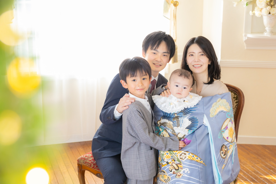 横浜店人気の大広間スタジオで掛着をお召しになった男の子様とご家族様をお撮りしたポートレートです。
