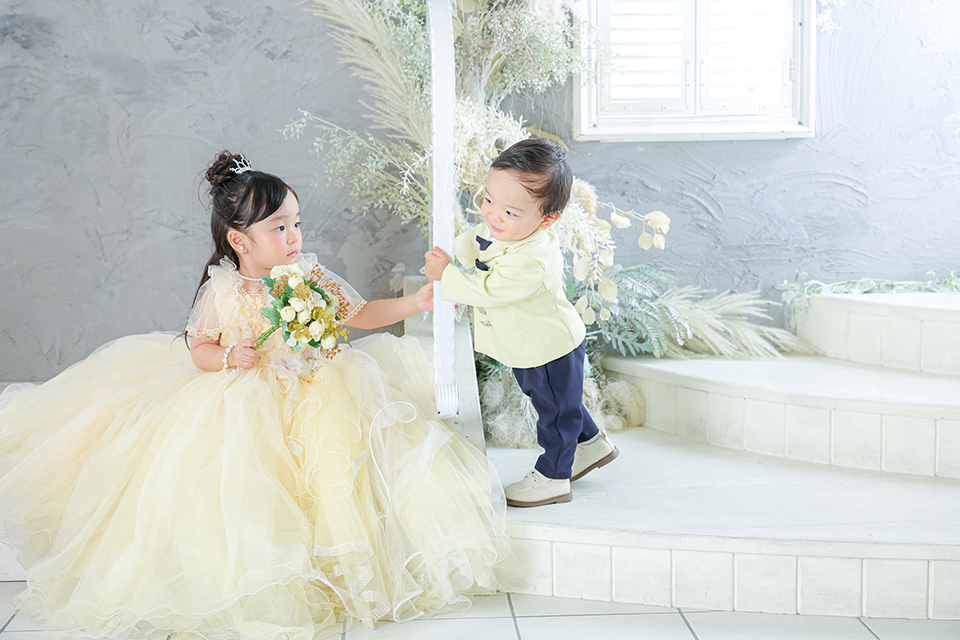 ドライフラワーの飾られたグレースタジオで、お姉様と遊ぶ主役様のとても可愛らしいお写真です。