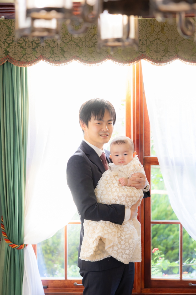 横浜店人気の英国風邸宅 応接室スタジオでベビードレスをお召しになった男の子様とお父様をお撮りしたポートレートです。