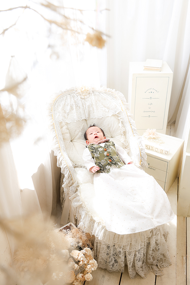 衣装はご家族様がそれぞれのイメージや、似合うかどうかで決めたとのことで、グリーンベストがおしゃれなベビードレスがとてもお似合いでした。
