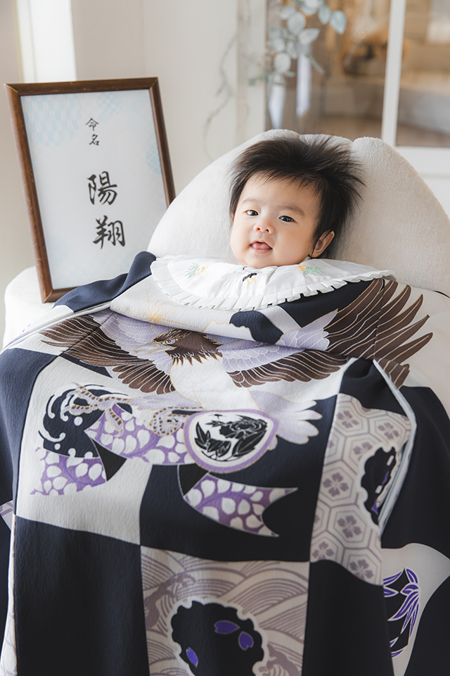 命名額との一緒のお写真では、背中に描かれた雄々しい鷹が見える形でお着付けして撮影させて頂きました。