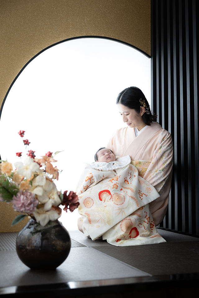 撮影では主役の赤ちゃんに合わせてお母様もお着物をお召しになり、自然光の明るいスタジオや、着物にぴったりの和室スタジオなど、色々なシチュエーションで撮影をお楽しみ頂きました。