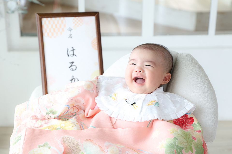 色が好みとご両親が選ばれた桜色の祝い着をお召しになった赤ちゃん。