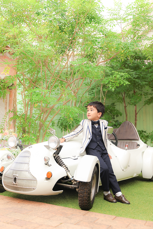 お庭スタジオにある車に寄りかかり、かっこよくポーズを決める5才様をお撮りした素敵な1枚です。