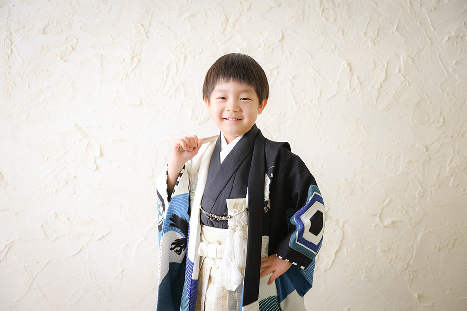 シンプルな漆喰壁の前で、羽織袴姿の5歳様をお撮りした素敵なポートレートです。