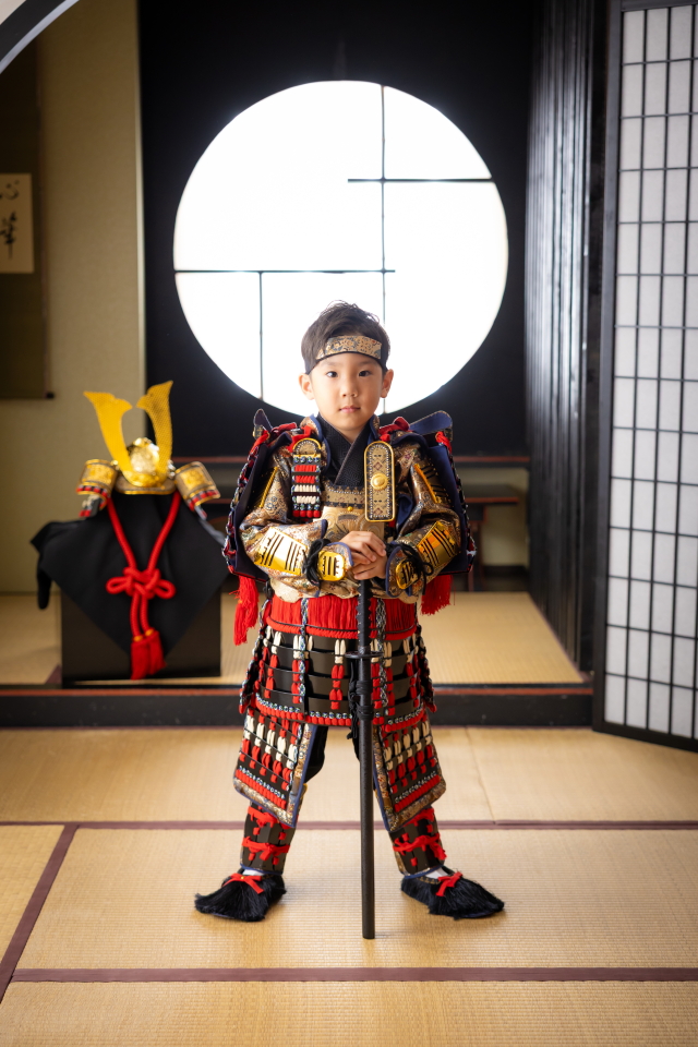 横浜店人気の和室スタジオで、鎧姿の5歳様をお撮りした素敵なポートレートです。