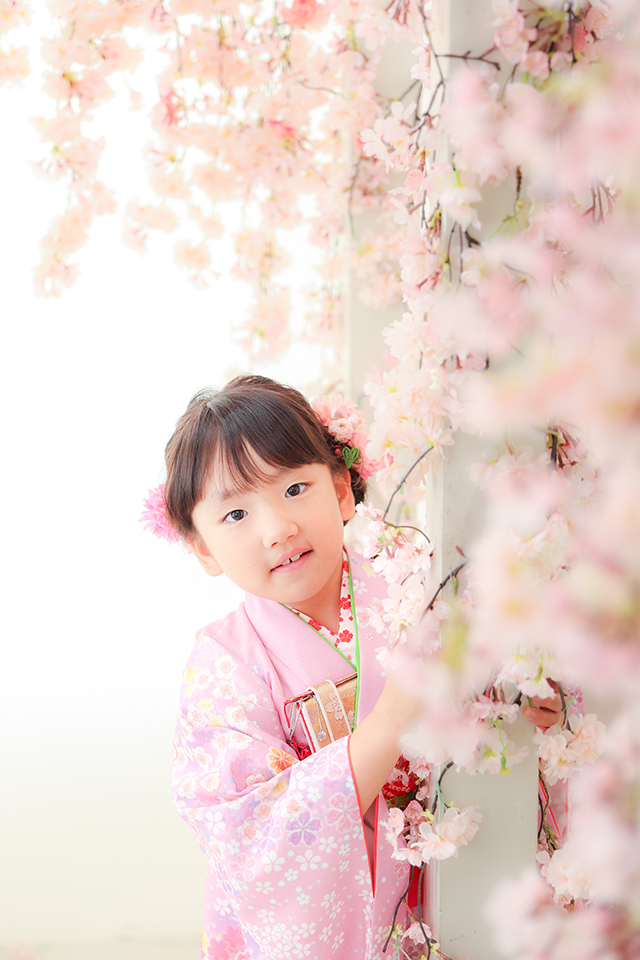 ピンクを基調とし、お花の柄が入ったお着物をお召しになり、満開の桜の中から顔を出す素敵な1枚です。