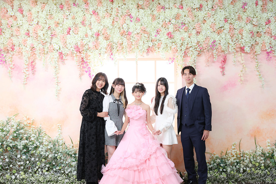 お花に囲まれた中、ピンクを基調としたドレスをお召しになられたお嬢様をご家族が包み込んでいるような記念写真です。