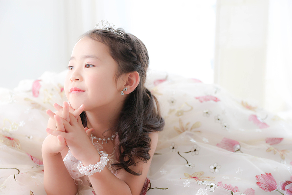 白を基調とし、お花が描かれたかわいらしいドレスに包まれた中、凛としたご表情が素敵な一枚となりました。