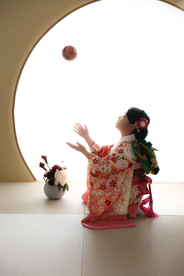当館人気の和室スタジオでてまりで遊ぶお嬢様。