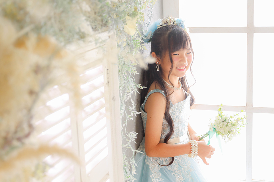 お衣裳は、レースの装飾が上品なブルーのドレスを選ばれました。