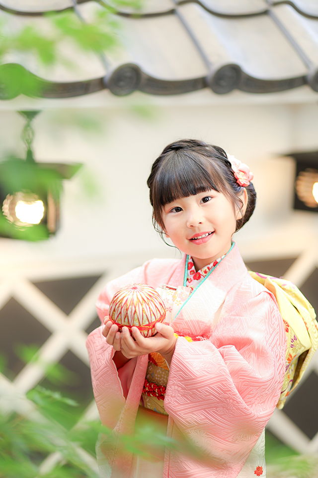 本格的な和風庭園スタジオでは、華やかな桃色の振袖をお召しになったお嬢様が毬を手にかわいく微笑む素敵な一枚を撮影させて頂きました。