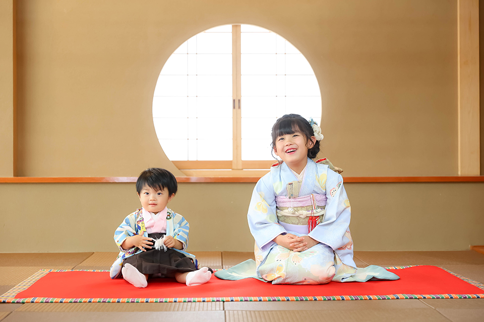 人気の和室スタジオで仲良く座られているご姉弟様の素敵なお写真です。