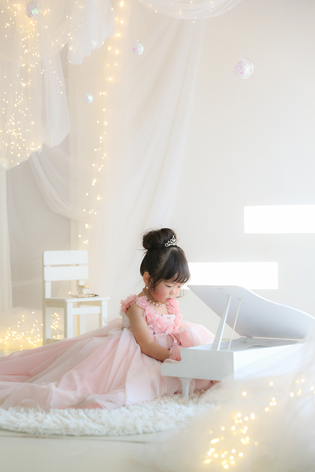 ホワイト×キラキラの空間で、ピアノを奏でるプリンセス。