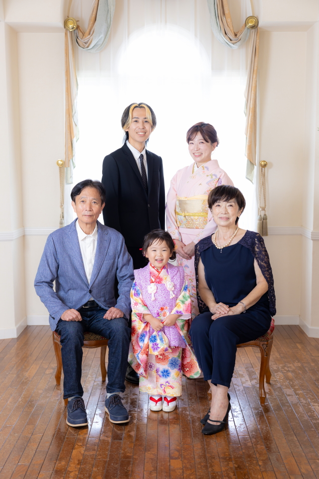 横浜店人気の大広間スタジオで、被布をお召しになったお嬢様とご家族・ご親族様をお撮りした素敵なポートレートです。