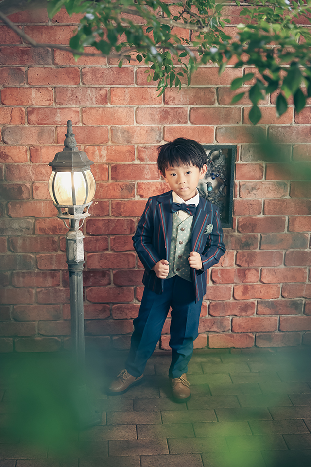 2着目の洋装撮影では、オシャレな街灯の隣でカッコよくポーズを決めた男の子様。
