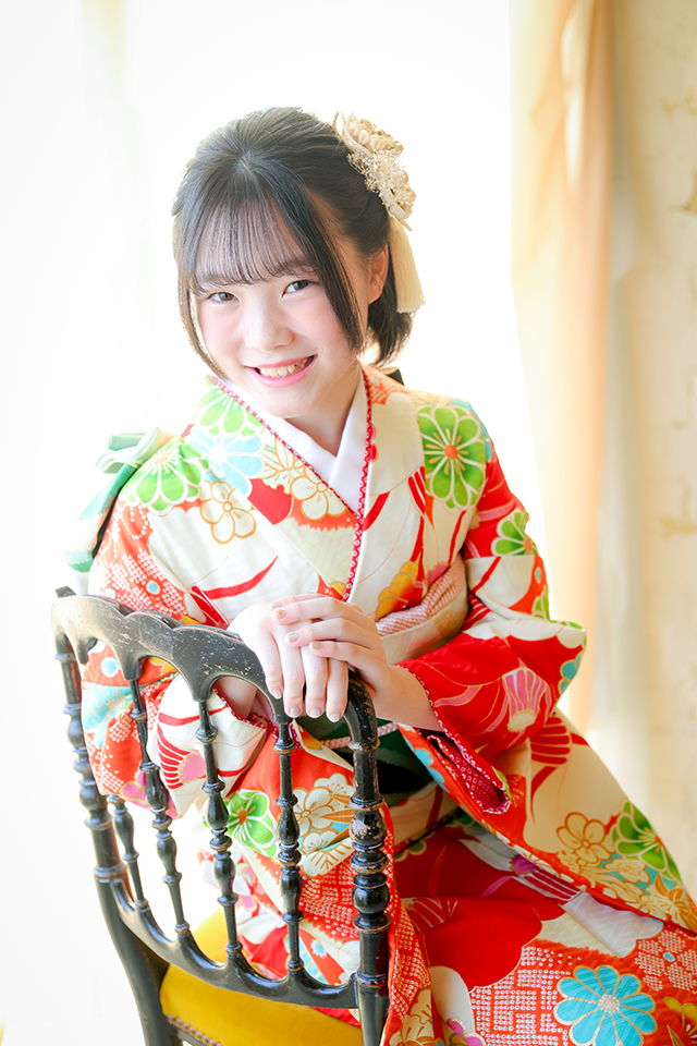 自然光差し込むナチュラルスタジオで、椅子に座るお嬢様の笑顔が素敵なお写真です。