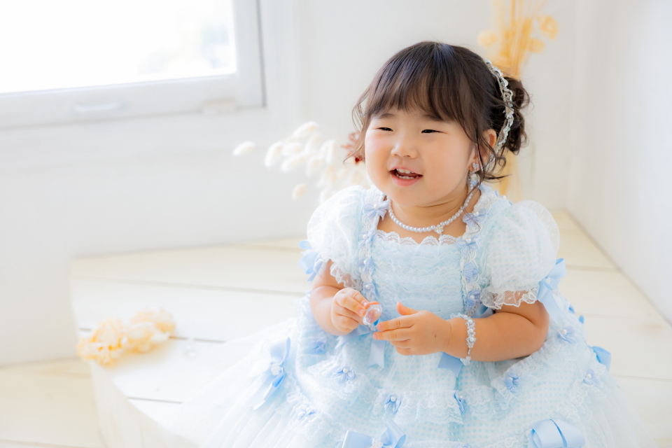 横浜店人気のホワイトツリースタジオで、ドレス姿のお嬢様をお撮りした素敵なポートレートです。