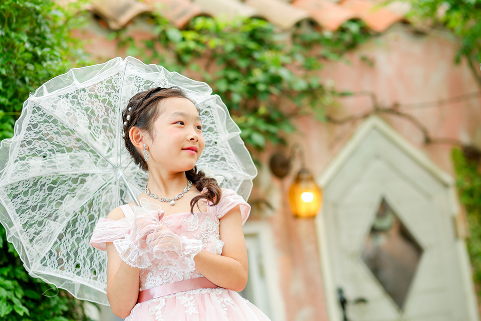 ガーデンスタジオ“アンの家”の前で、レース傘を持たれるプリンセスの笑顔が素敵なお写真です。