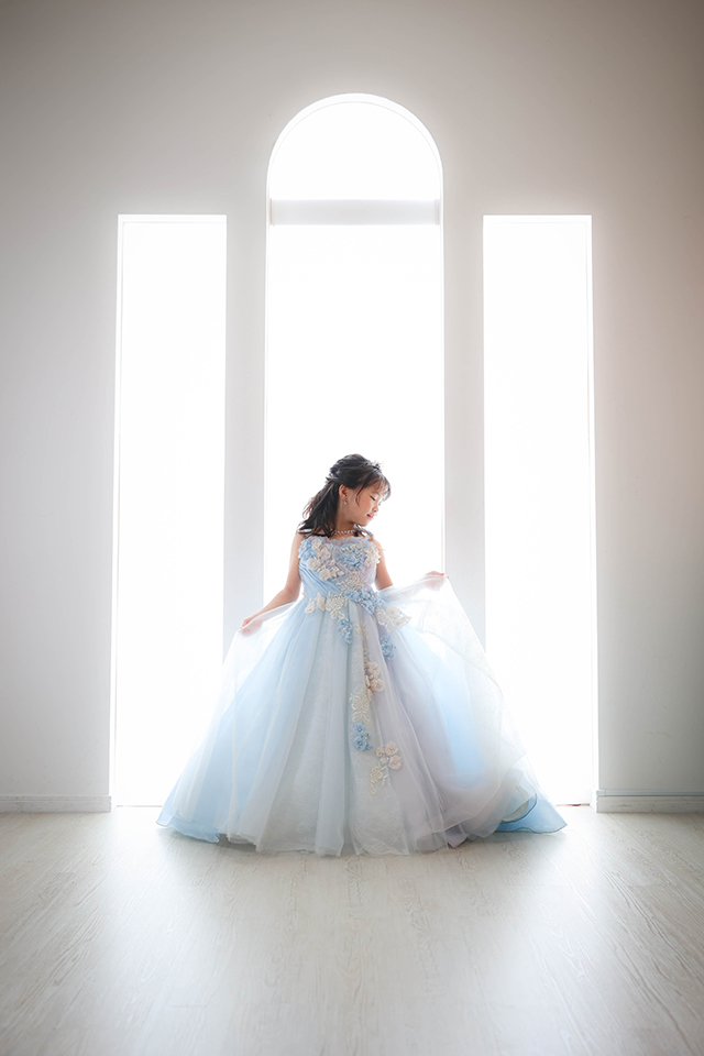 「七五三フォトプラン」をご利用いただき、本人が大好きな水色のドレスと、ピンクの着物での撮影を行いました。