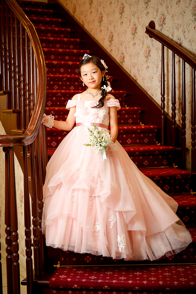 階段スタジオでブーケを持たれるプリンセスの素敵なお写真です。