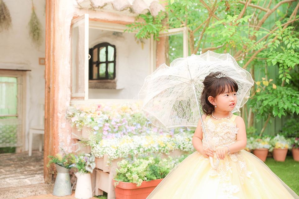 お嬢様がお召しになられている黄色のドレスは、「娘がディズニープリンセスに憧れていたので」とお決めくださいました。