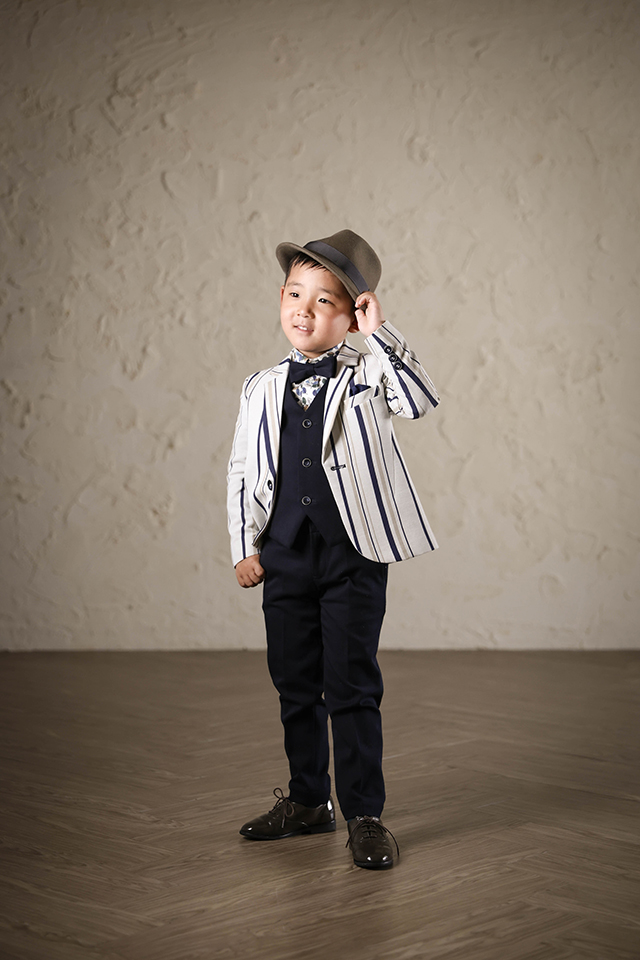 シンプルな漆喰壁の前で、ハットを被ったスーツ姿の5歳様をお撮りした素敵なポートレートです。