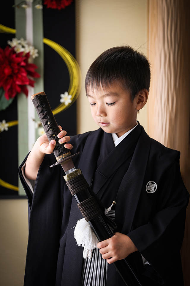 和室スタジオの掛け軸の前で、かっこよく刀を握る5才様の素敵なポートレートです。
