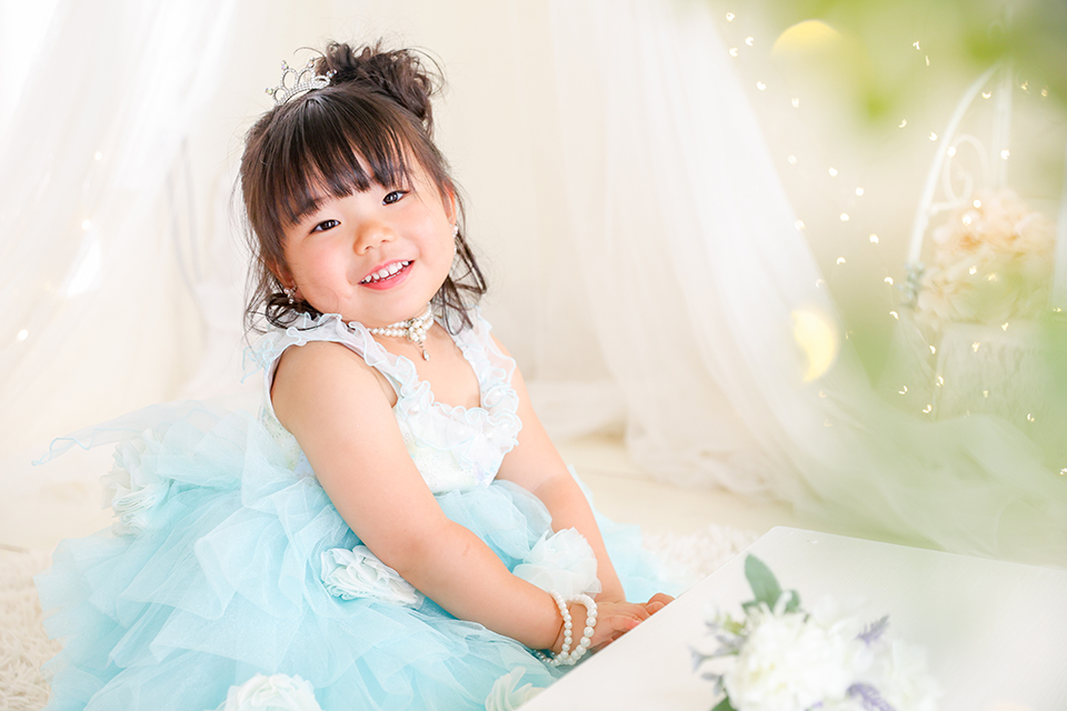 キラキラのナチュラルスタジオで、プリンセスの笑顔が素敵なお写真です。