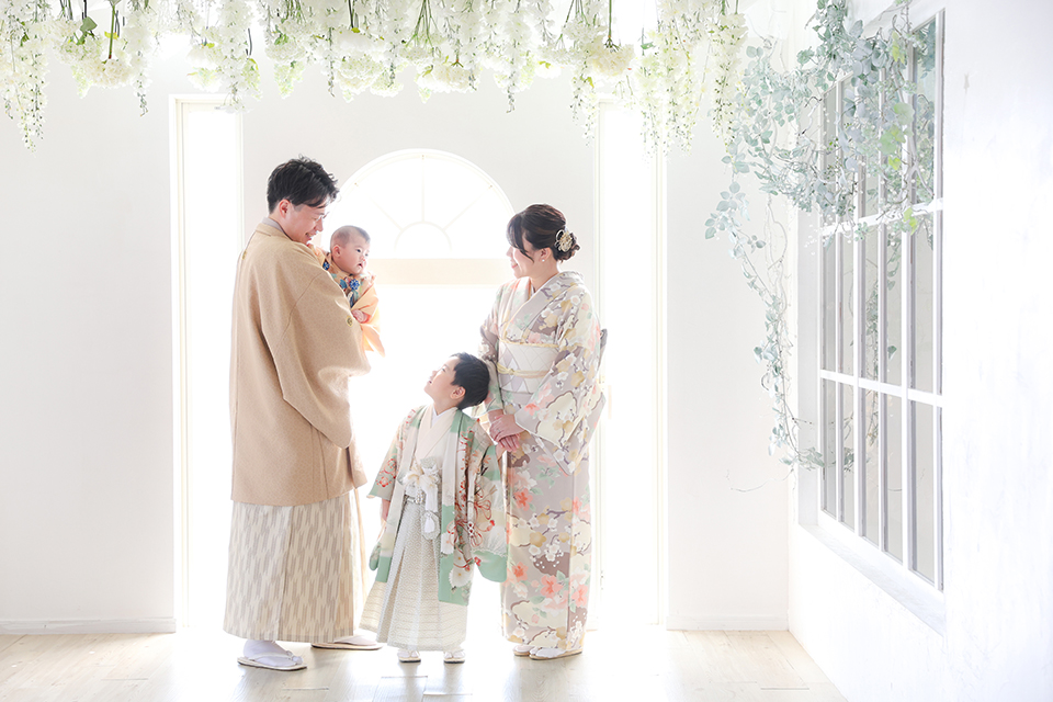 秋に神社などへお参りに行く際にお着物レンタルができる『おでかけレンタルプラン』をお申し込み頂き、前撮りではご家族皆さまで和装をお召しになり、撮影を楽しまれました。