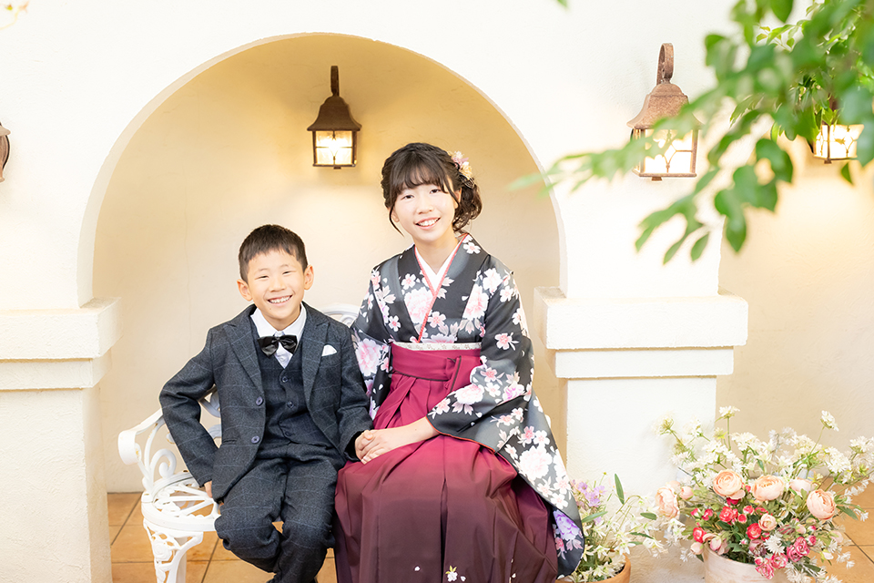 撮影では弟様もスーツをお召しになり、南欧風ガーデンスタジオでは笑顔の素敵なごきょうだいショットを撮影させて頂きました。