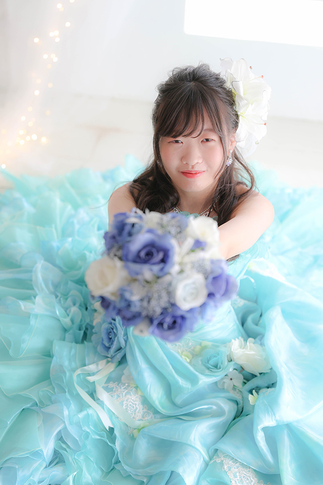 白を基調とした空間で、ドレス姿のお嬢様をお撮りした素敵な一枚です。