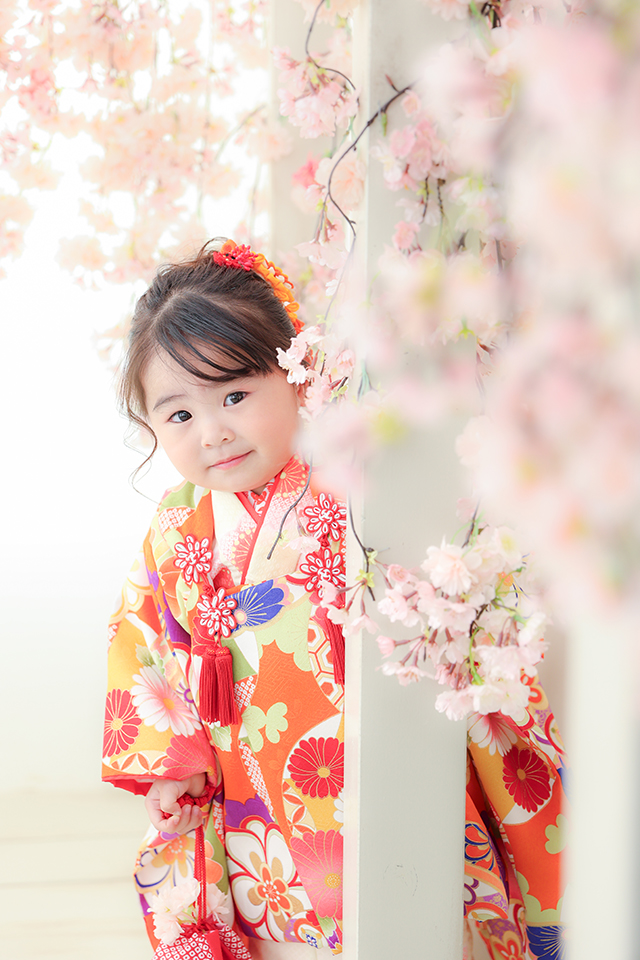 市川店人気の桜スタジオで、満開の桜の中から「ちょこっ」とお顔を出すお嬢様の素敵な1枚です。