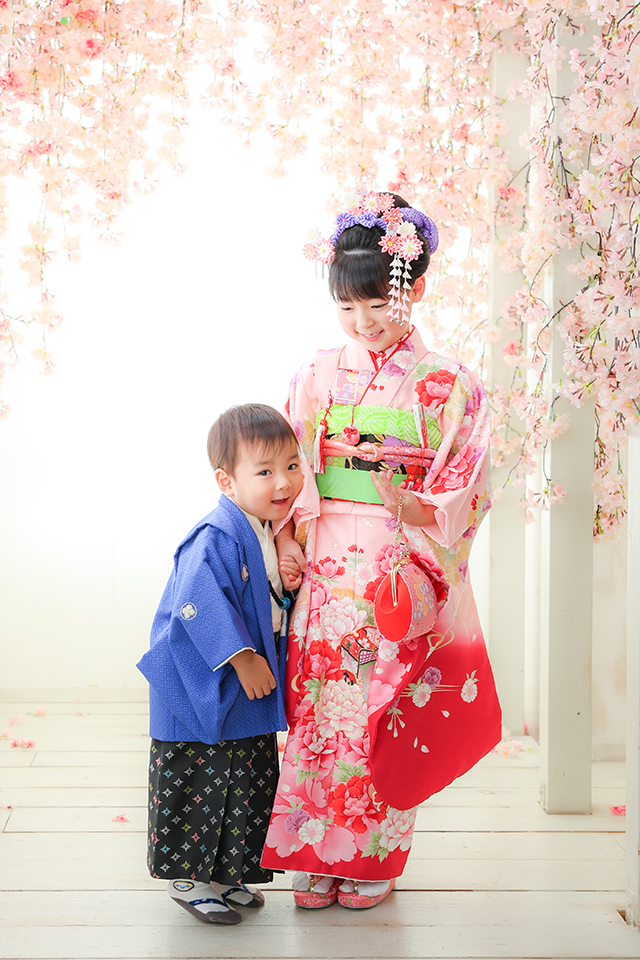 満開の桜の中、和装をお召しになられたごきょうだい様の仲の良さが伝わる素敵な一枚。