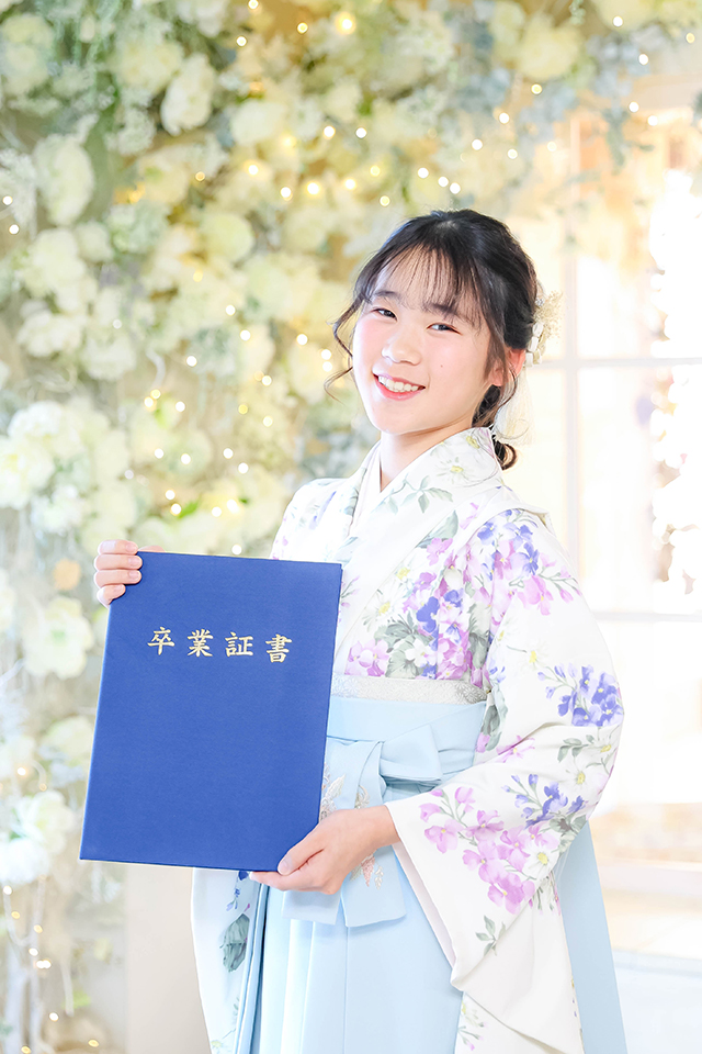 自然光の差し込むナチュラルスタジオで、卒業証書を持つお嬢様の笑顔が素敵なお写真です。