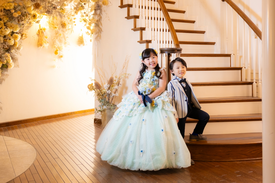 横浜市中区のおしゃれな写真館「アンズガーデン横浜店」でドレス姿のお姉様とスーツ姿の弟様をお撮りした素敵なポートレートです。