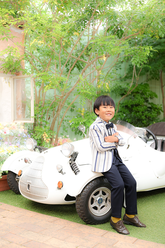 新緑に囲まれたお庭で、タキシード姿の5歳様をお撮りした素敵なポートレートです。