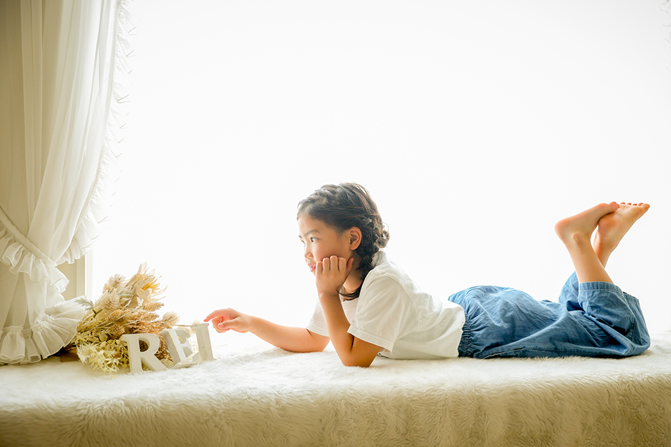 自然光差し込む出窓スタジオで、お花を見つめるお嬢様の素敵なお写真です。