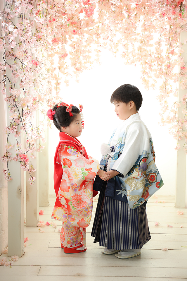 市川市おしゃれなフォトスタジオ「アンズガーデン市川店」の人気の撮影シーン〝満開の桜"の中でお撮りした七五三5つと3つのお祝いのお写真です。
