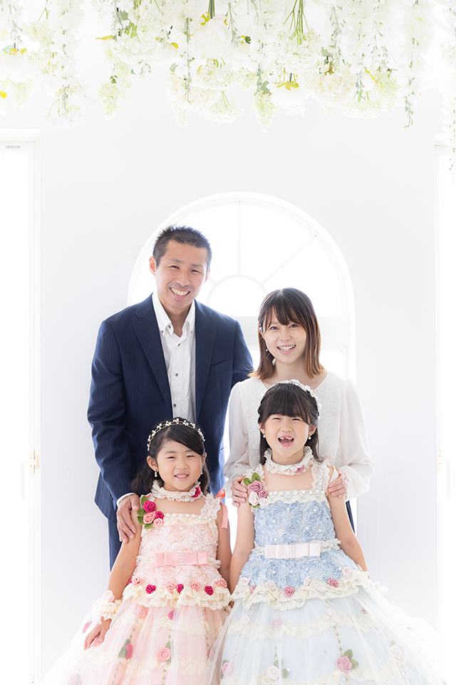 色違いのドレスをお召しになったご姉妹様。髪型もおそろいにされて、可愛い2人のプリンセス姿にご両親も喜んでいらっしゃいました。