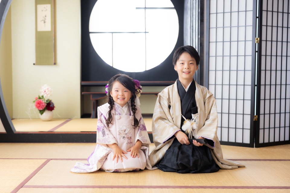 横浜店人気の和室スタジオで、被布をお召しになったお嬢様とお兄様をお撮りした素敵なポートレートです。