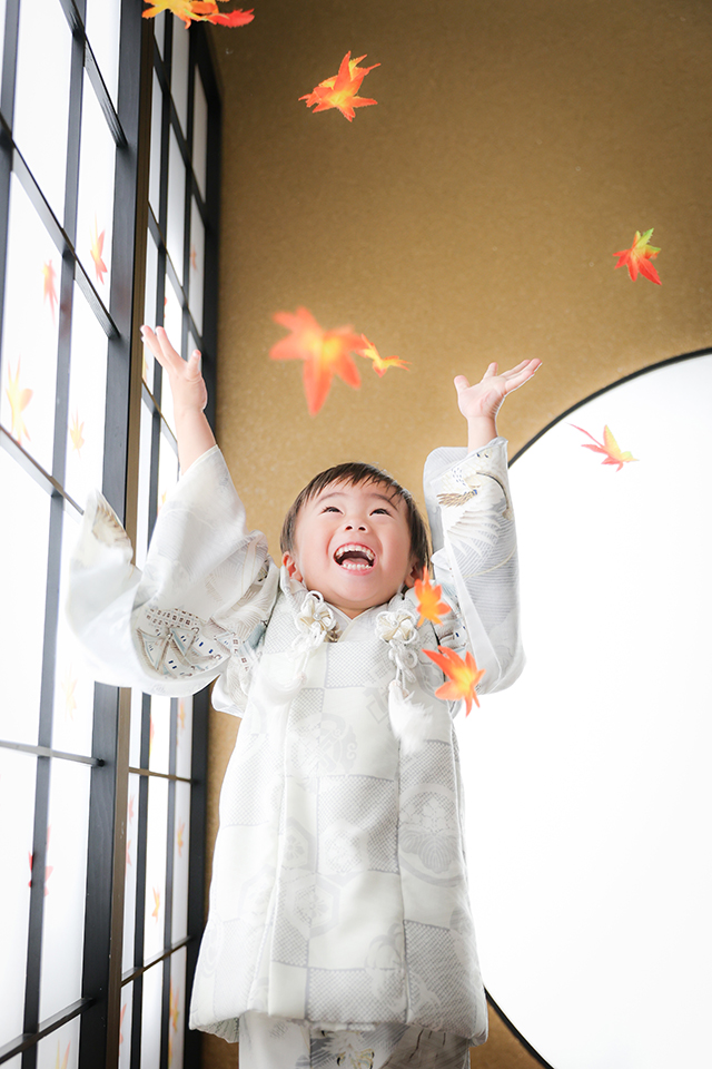 和室にて舞い散るモミジの葉っぱを捕まえようと元気いっぱいに手を伸ばす男の子様をお撮りした素敵な一枚。
