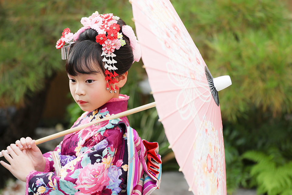 市川店のガーデンスタジオで日本髪を結ったお嬢様に傘をお持ちいただきお撮りした1枚。