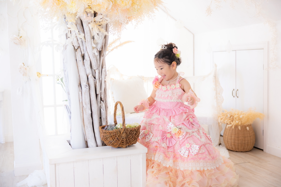 横浜店人気のホワイトツリースタジオで、ドレス姿のお嬢様をお撮りした素敵なポートレートです。