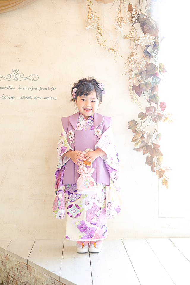 お嬢様の好みを尊重してお着物も被布も紫のお色を選びました。
